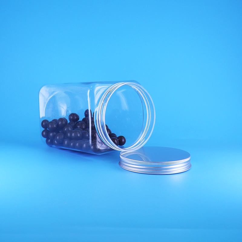 Διαφανή, φθηνά, άδεια, τετράγωνα, πλαστικά βάζα PET για καραμέλες, ψηλά, χύμα, με επίπεδο καπάκι αλουμινίου